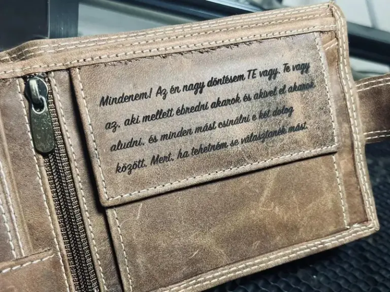 Szép kivitelezés, minőségi munka. Már négy hónapja van meg két megrendelt, gravírozott pénztárca és tartós is, sehol egy karcolás.